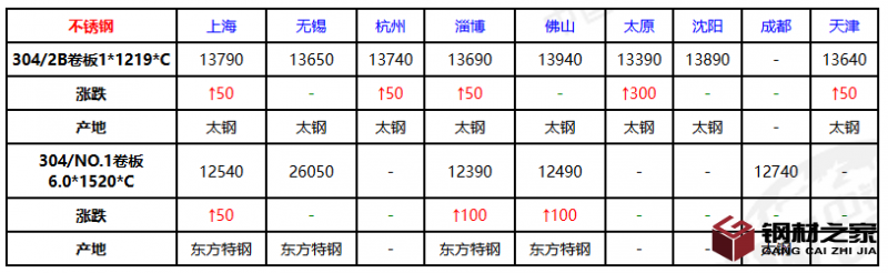 全國(guó)8個(gè)主要市場(chǎng)304/2B卷板1*1219*C平均價(jià)格13716元/噸,較上個(gè)交易日上調(diào)62元/噸。